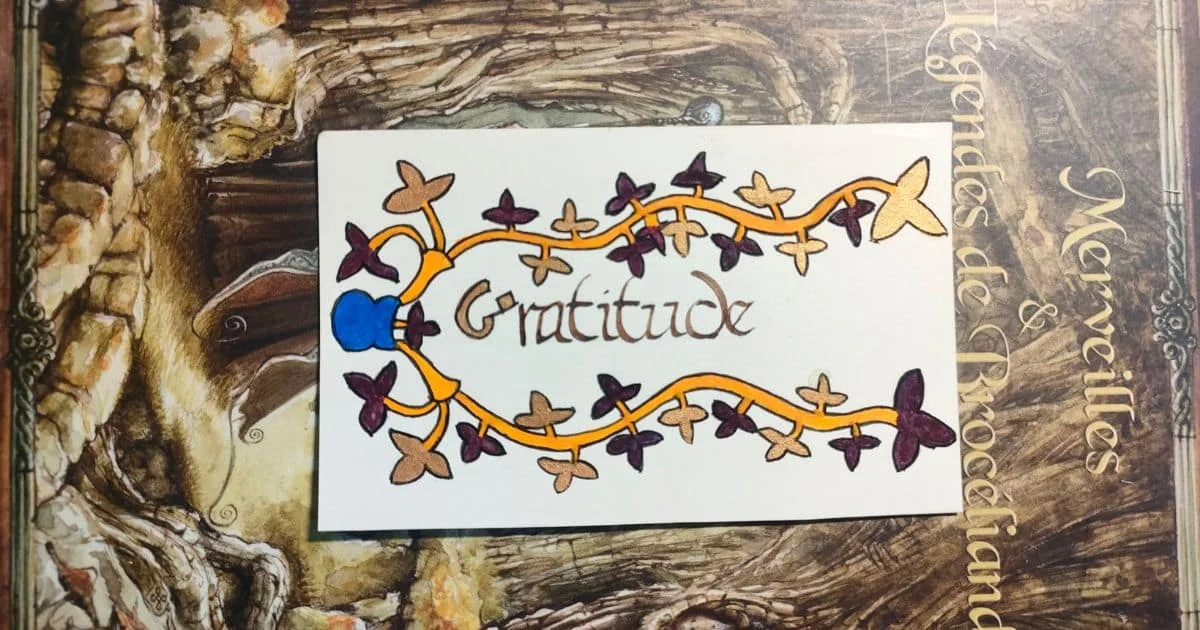Marque-page calligraphié et enluminé Gratitude. La calligraphie est vibratoire parce que je suis aussi thérapeute énergétique Lahochi. Pièce unique. Brou de noix, encre et gouache. Dimensions 6,5×10,5 cms. Les dimensions sont choisies en relation avec le nombre d’or et aussi pour que le marque-page soit utile dans beaucoup de types de livres différents, des livres brochés, des livres de poches mais aussi des livres plus atypiques comme des livres pratiques ou des livres plus carrés.. Les marque-pages peuvent avoir quelques différences par rapport au modèle proposé notamment des variations de l’épaisseur du trait de plume pour le mot. Couleurs orange, violet et or, initiale or. Envoi sous 48h ouvrées si le marque-page est en stock. Le prix est déterminé par la numérologie.